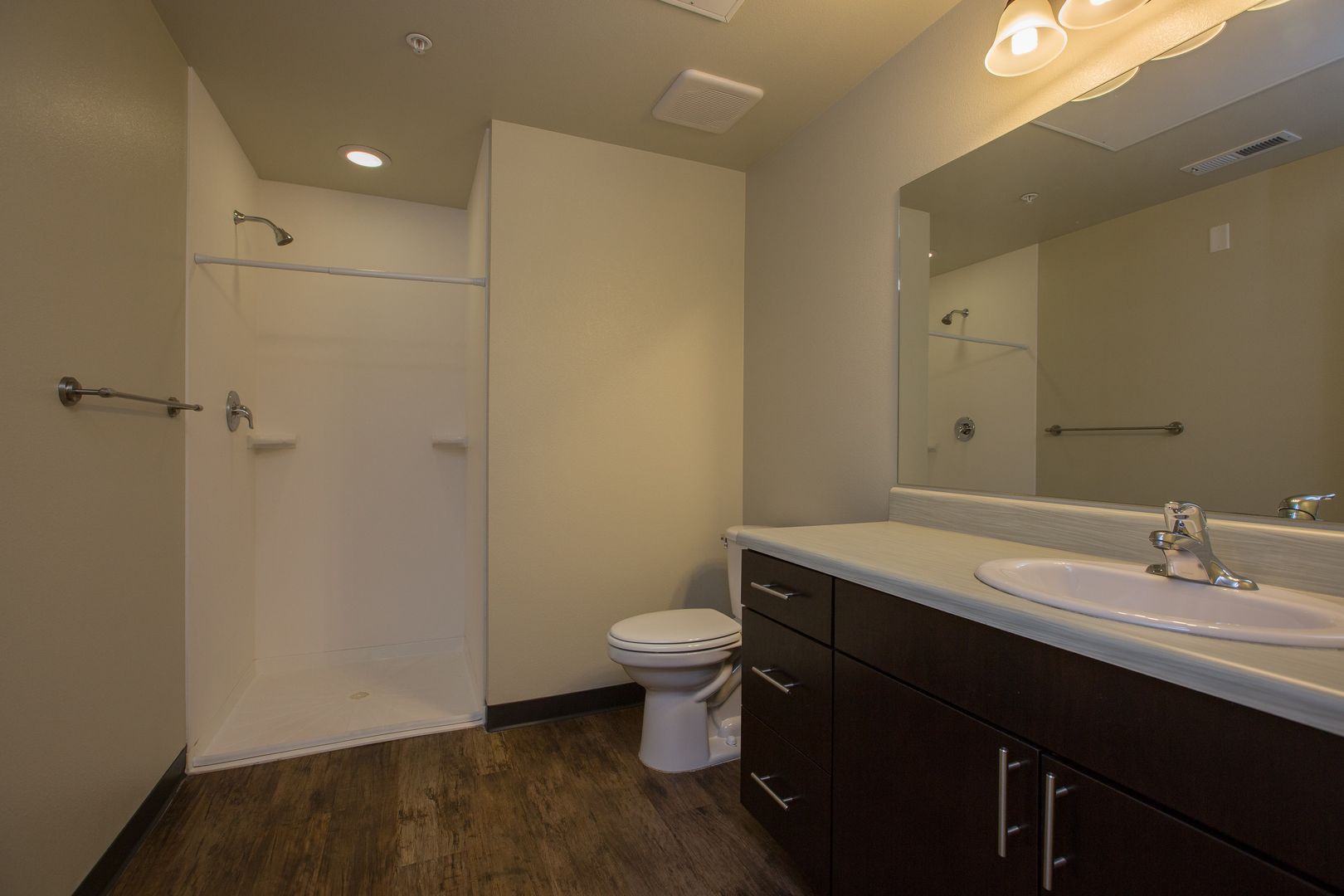 - Wood plank flooring in main living areas and bathrooms
