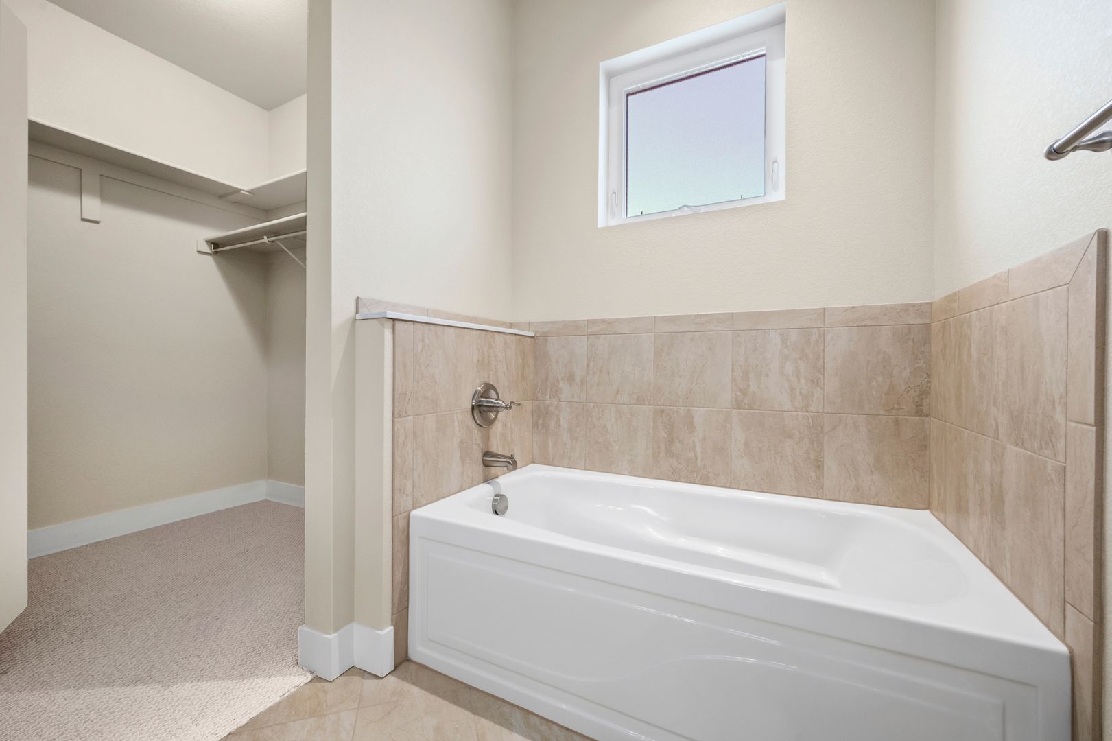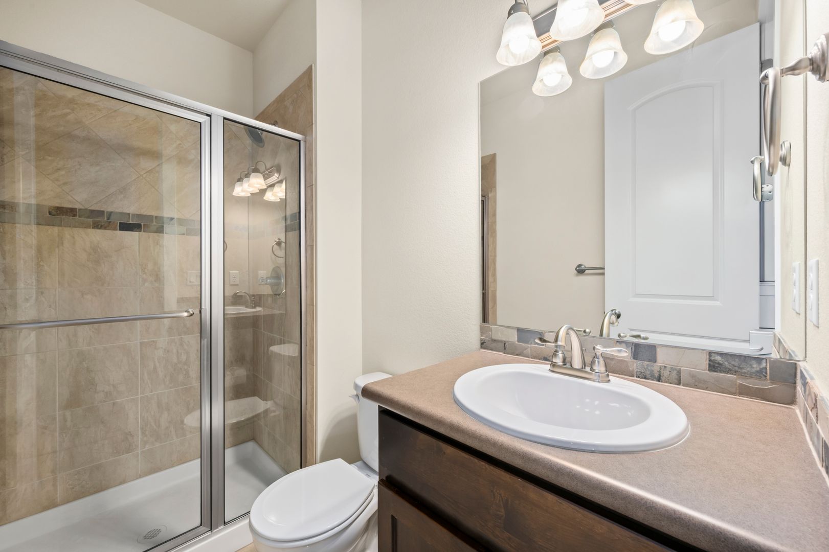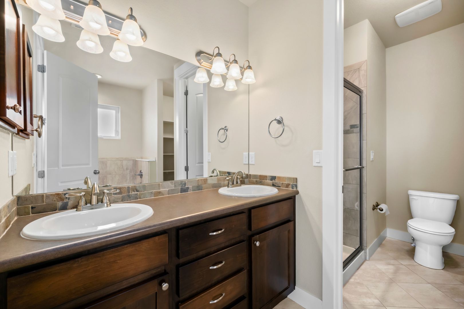The primary suite includes a raised ceiling, walk-in closet, and a luxurious five-piece bath with detailed tile work and a separate water closet. The second bathroom features a large tiled walk-in shower. Washer and dryer are conveniently located near the bedrooms.