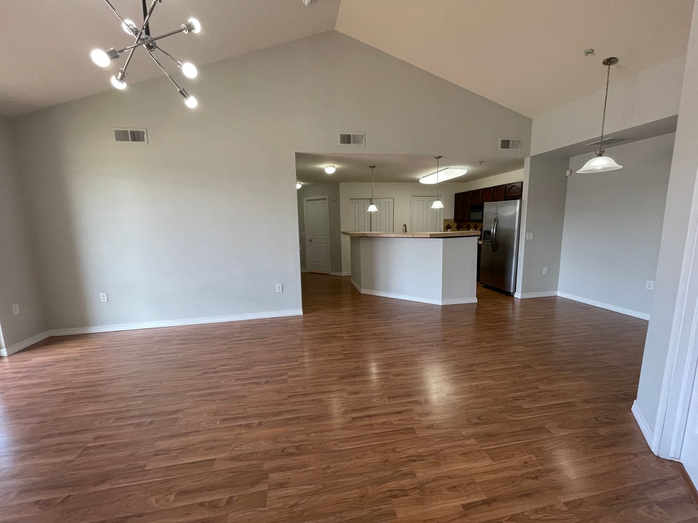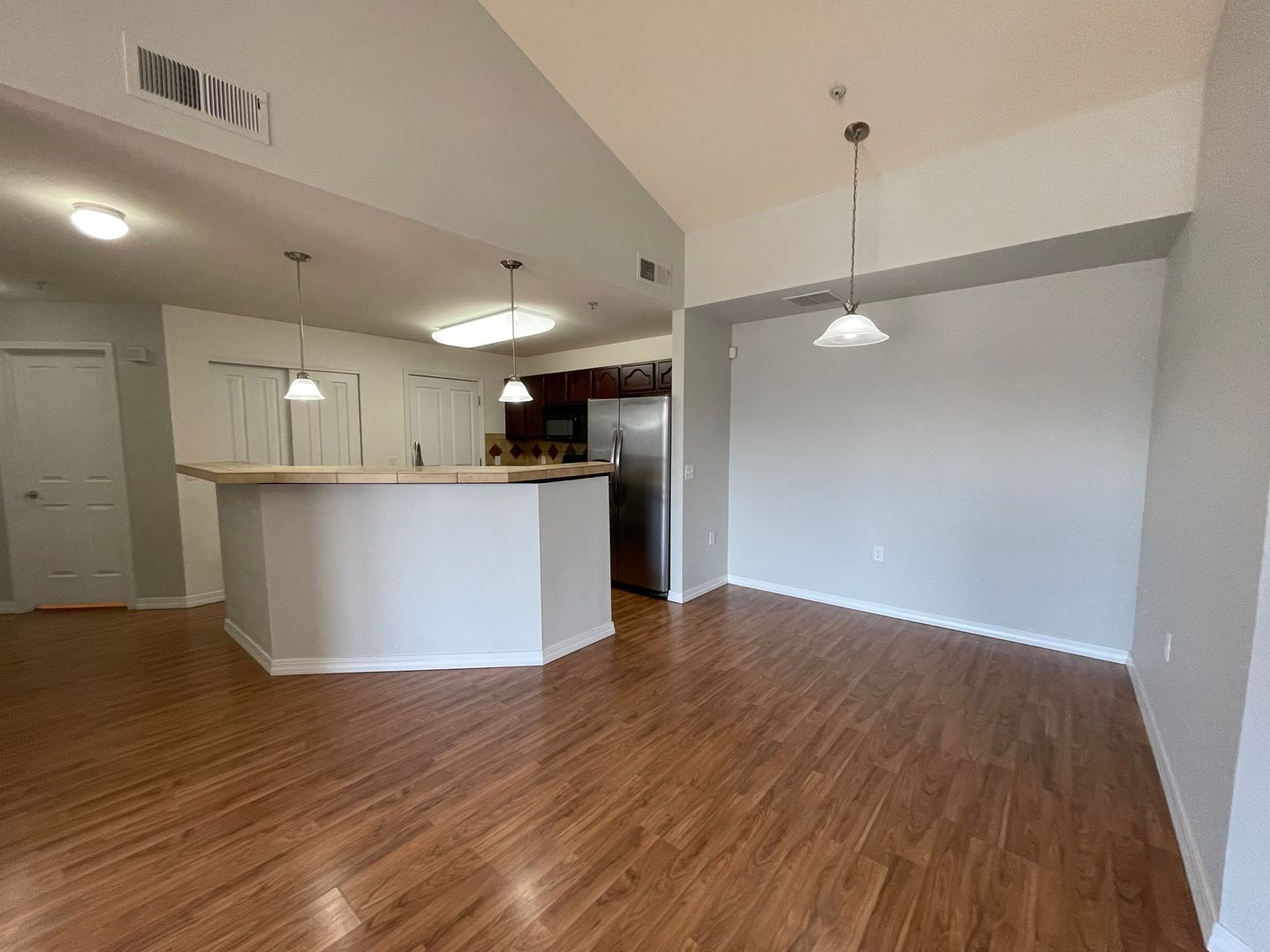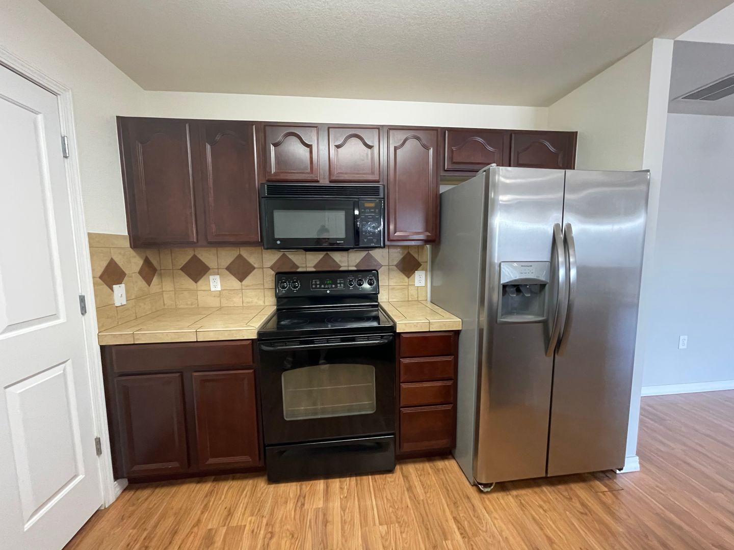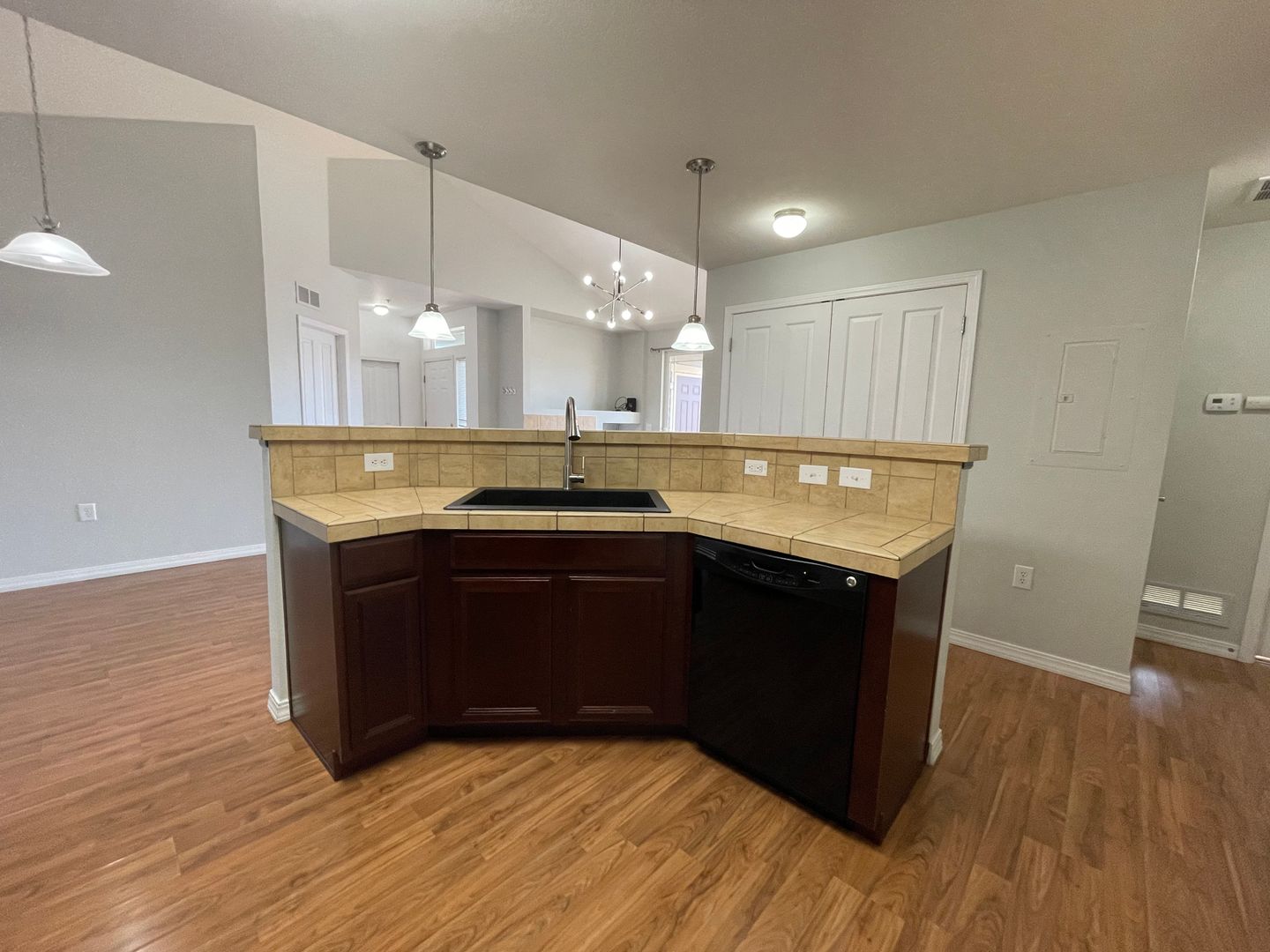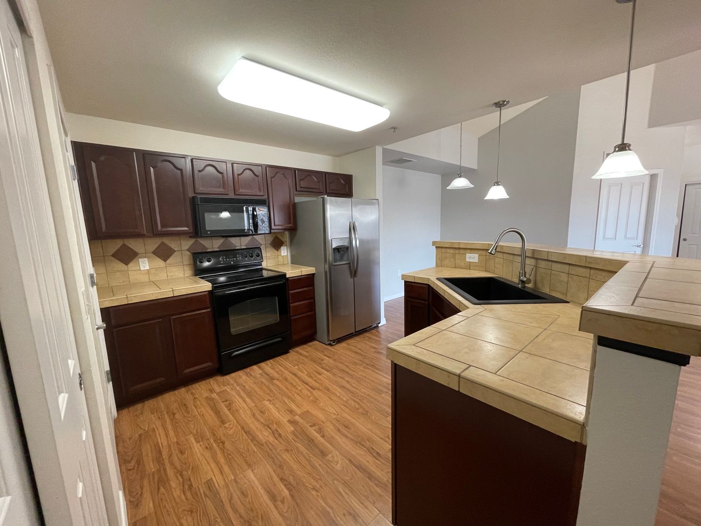 This inviting condo features laminate flooring throughout the kitchen, living, and dining areas, creating a warm and cohesive living space. The open kitchen is both stylish and functional, showcasing tile countertops, rich mahogany cabinetry, and plenty of storage.