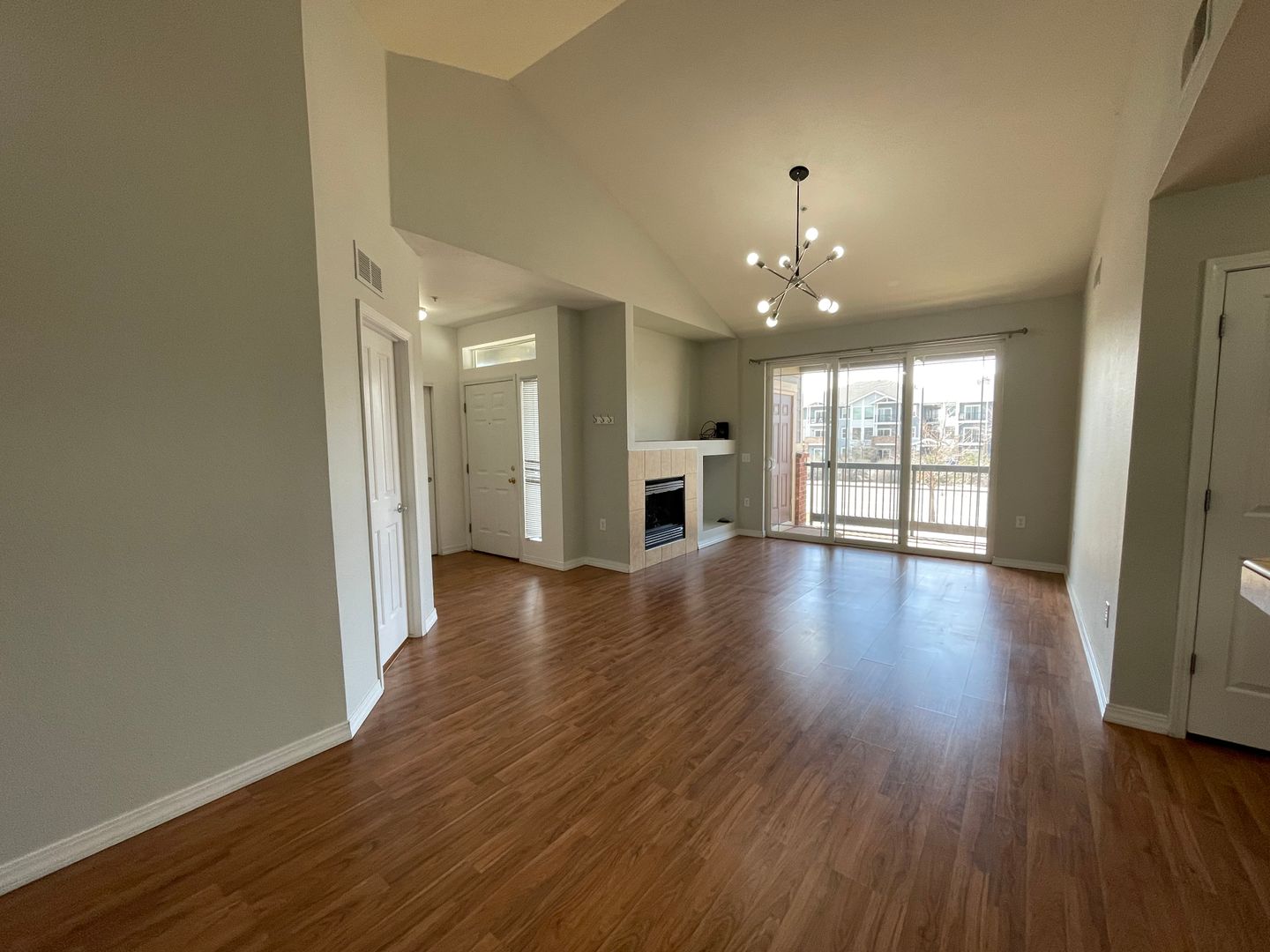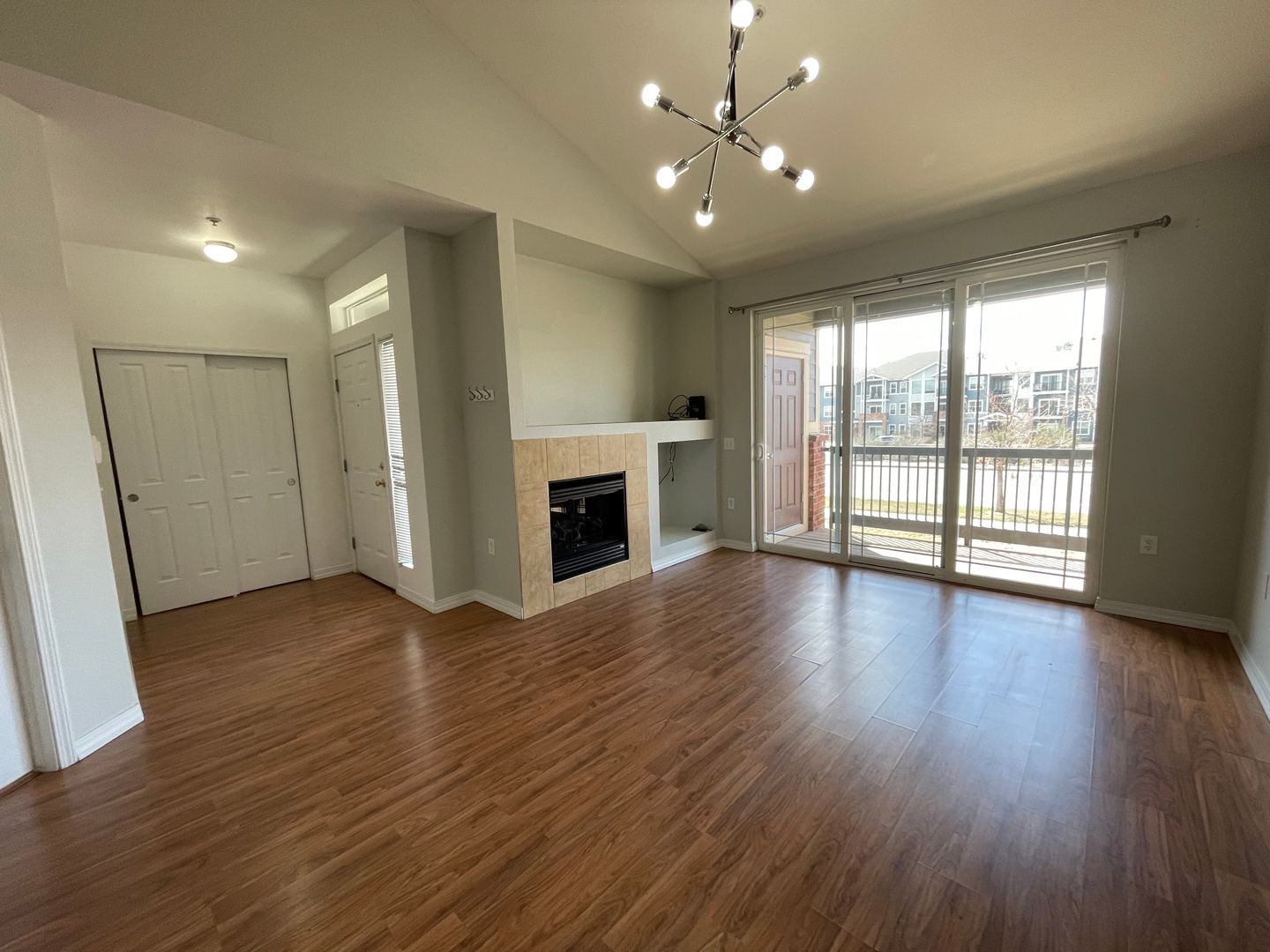 The spacious living room offers a cozy fireplace and direct access to a private balcony, perfect for relaxing outdoors, along with an exterior storage closet for added convenience.