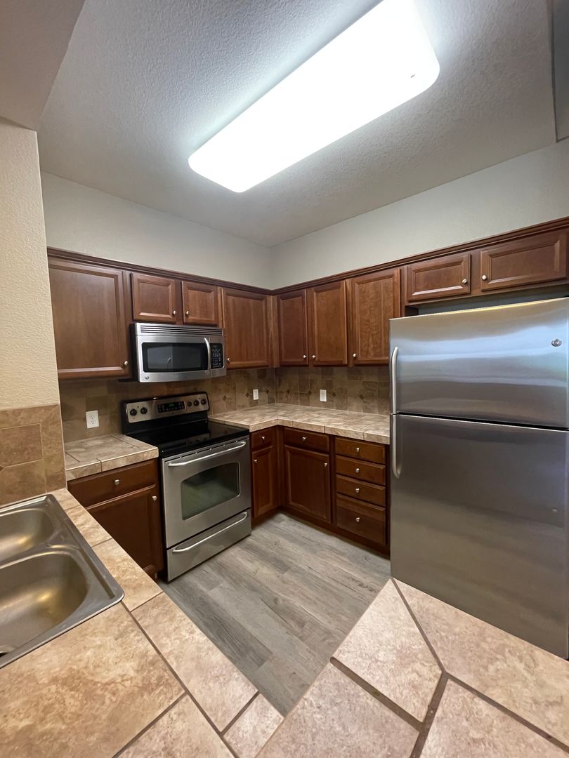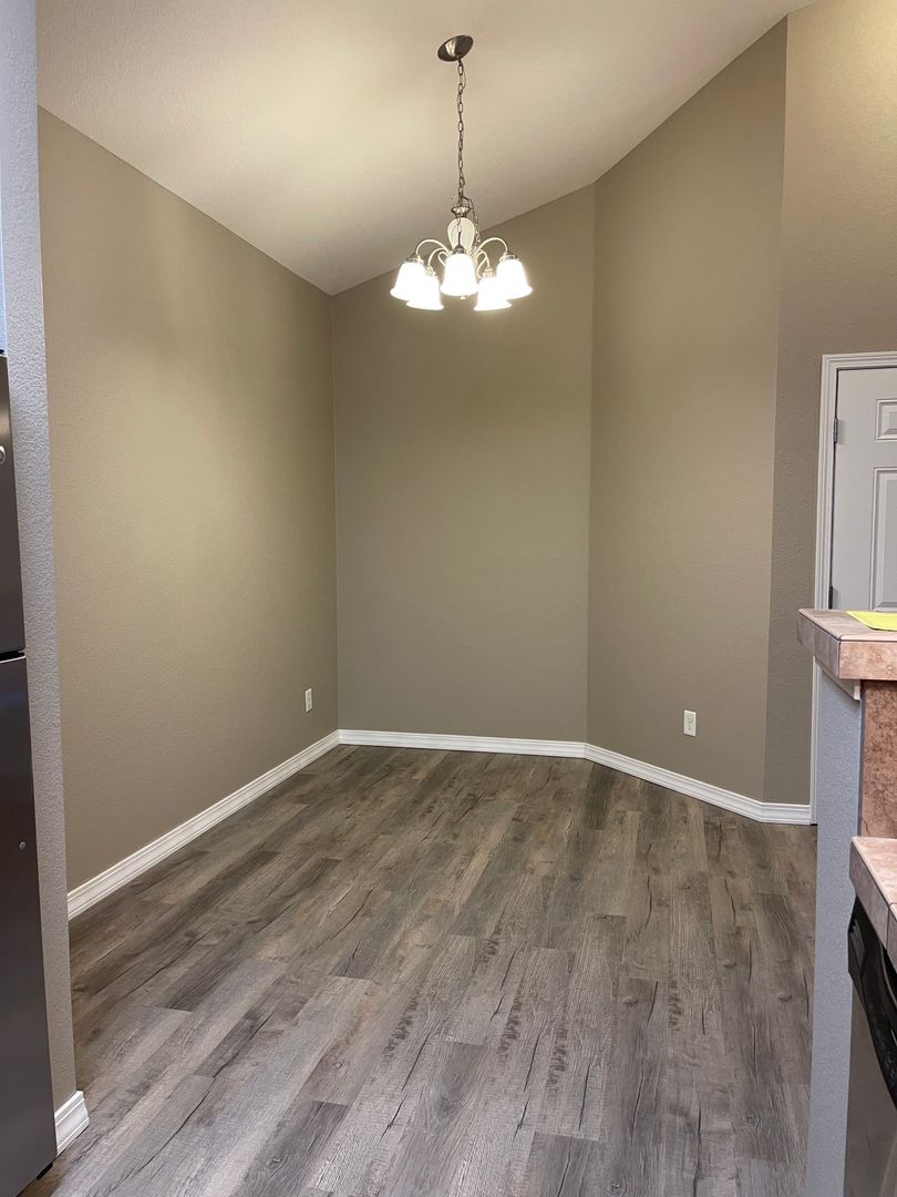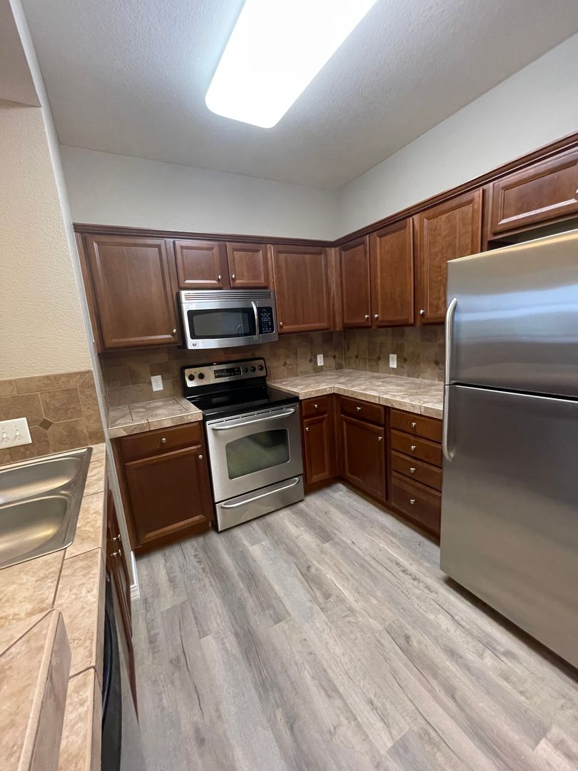 This inviting home features laminate flooring in the kitchen and dining areas, along with decorator tile countertops and backsplash that add style and character. Stainless steel appliances complete the functional kitchen, making it perfect for everyday living and entertaining.