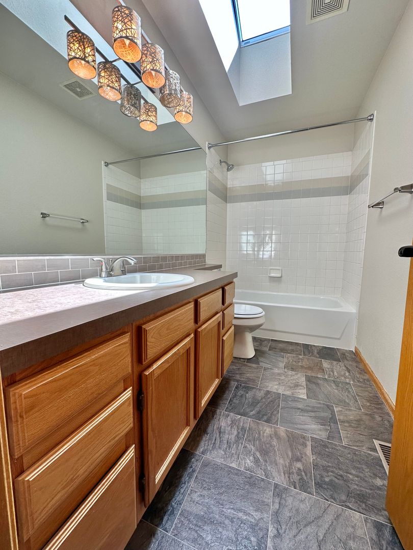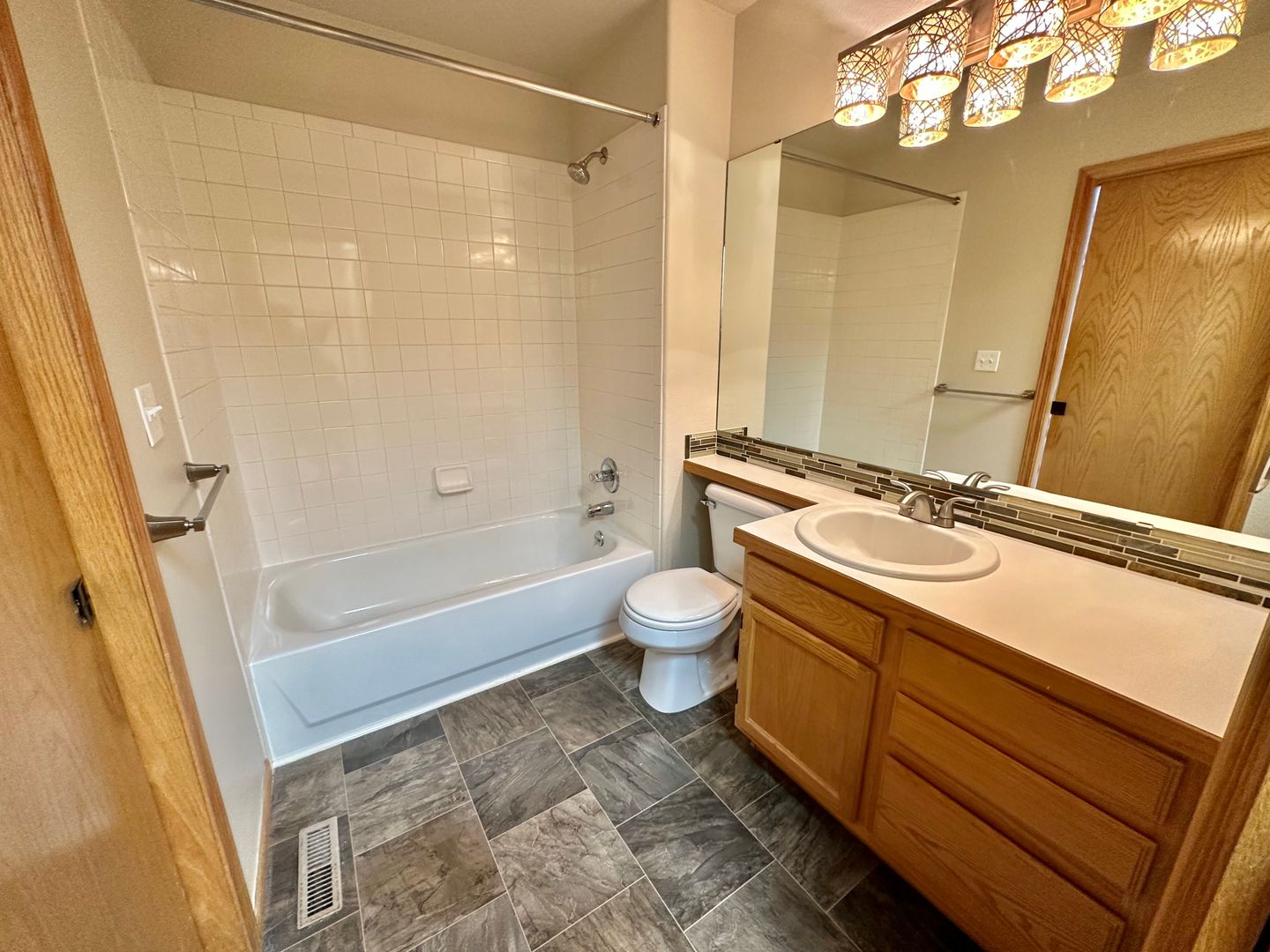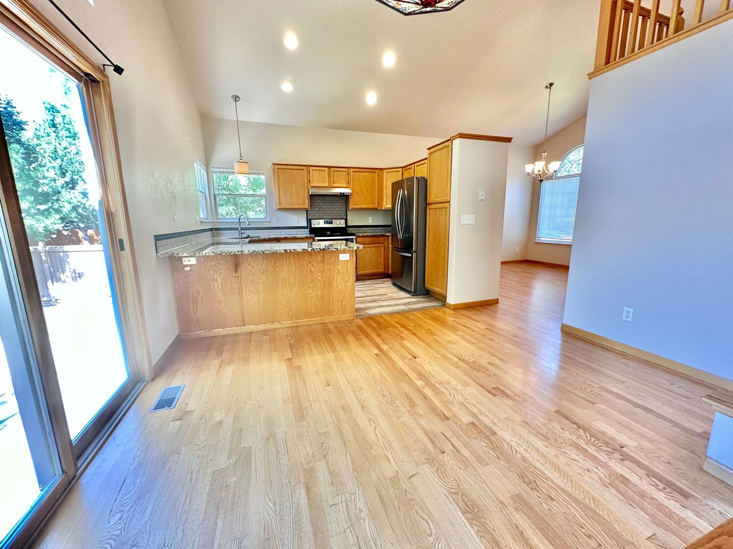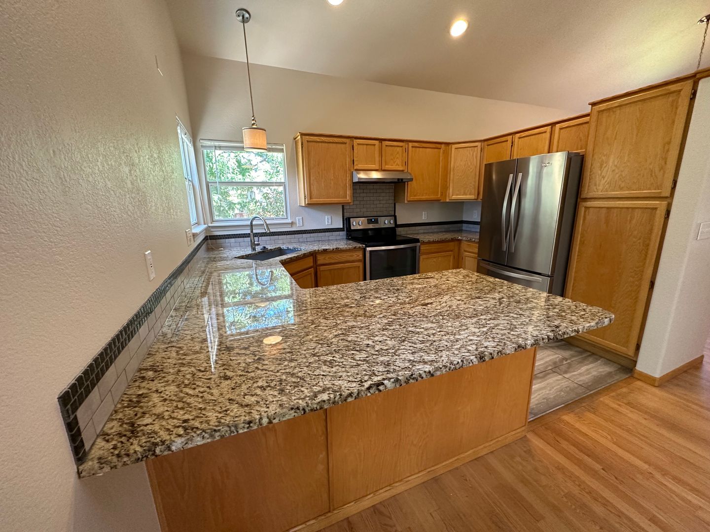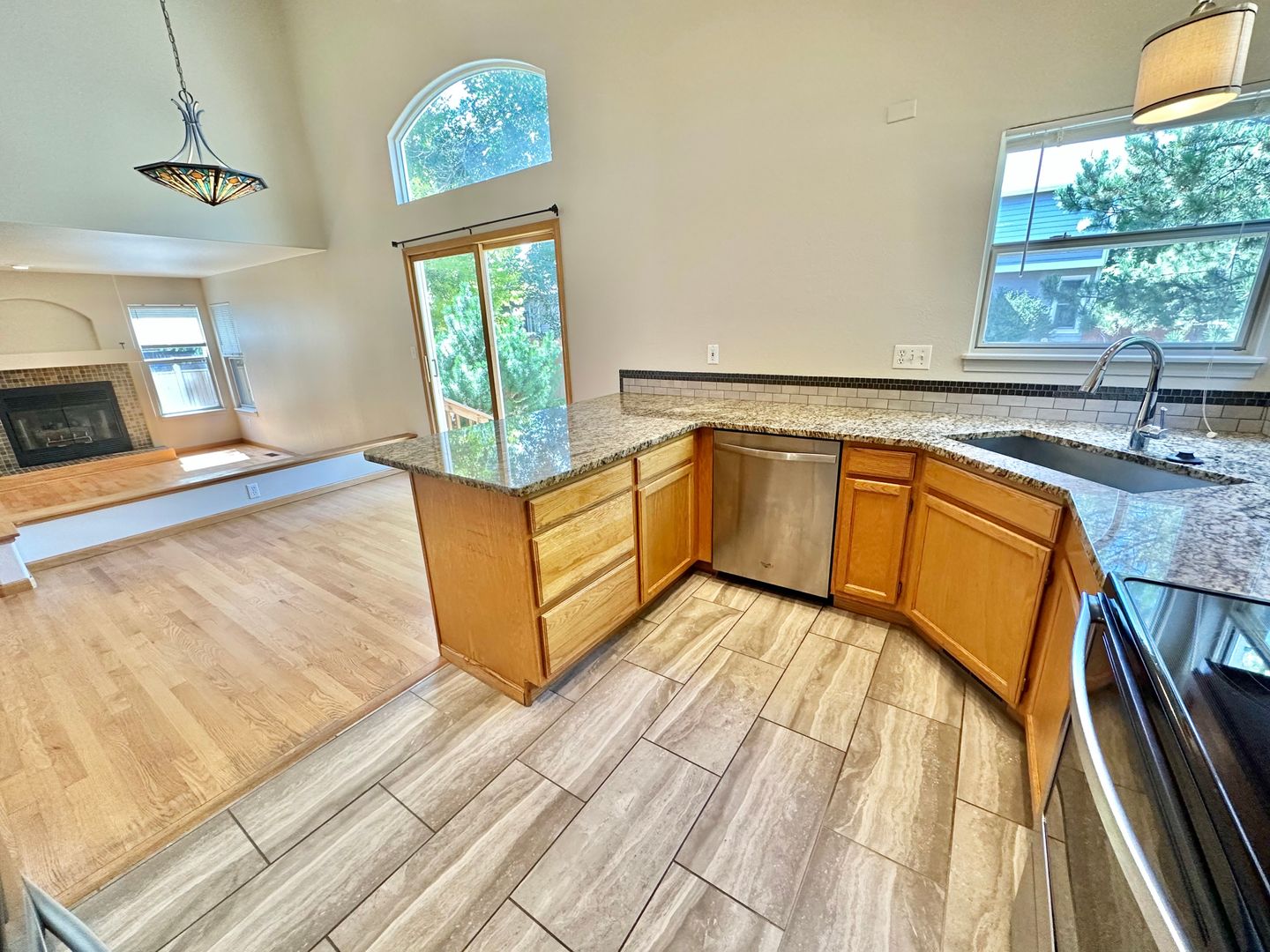 Inside, you’ll find vaulted ceilings and a bright, open layout with versatile living spaces throughout. The remodeled kitchen features stainless steel appliances, tile flooring, updated light fixtures, and modern finishes. A cozy gas fireplace and central air conditioning ensure comfort year-round.