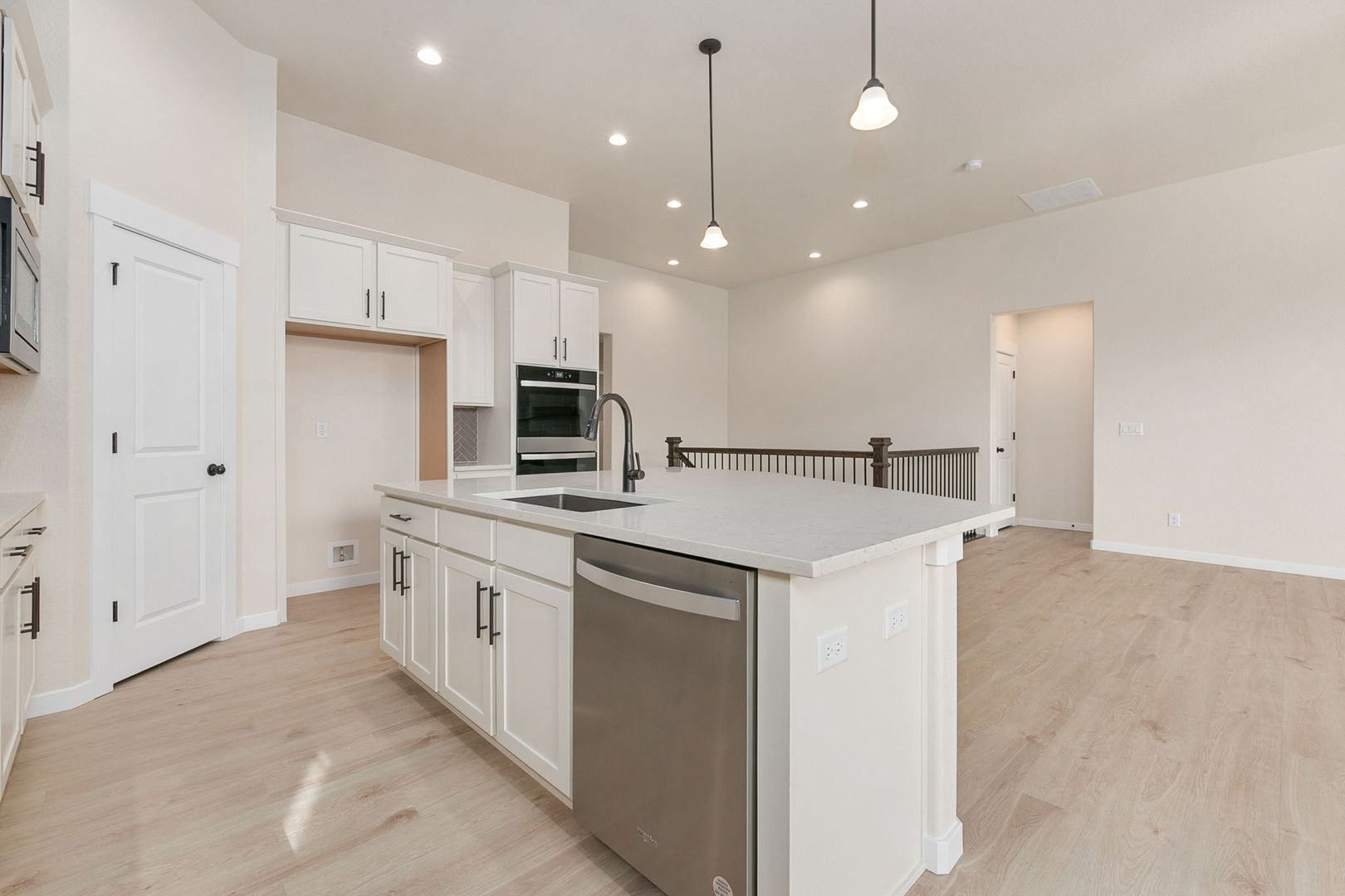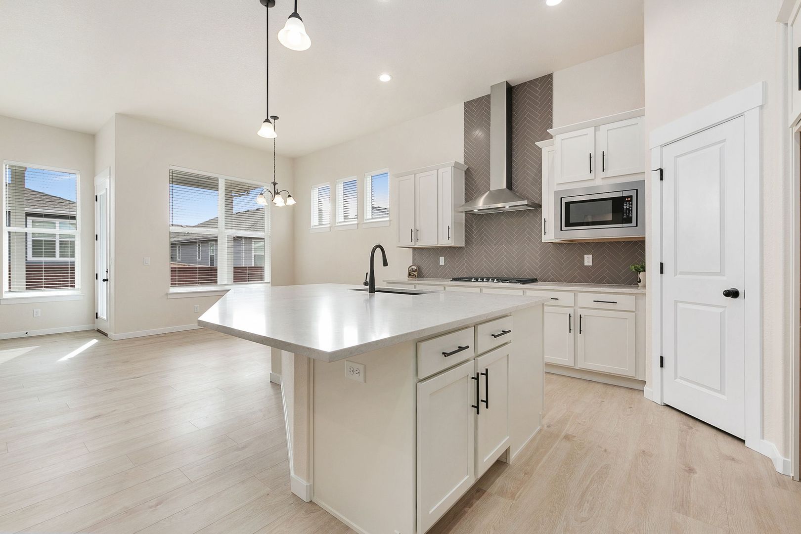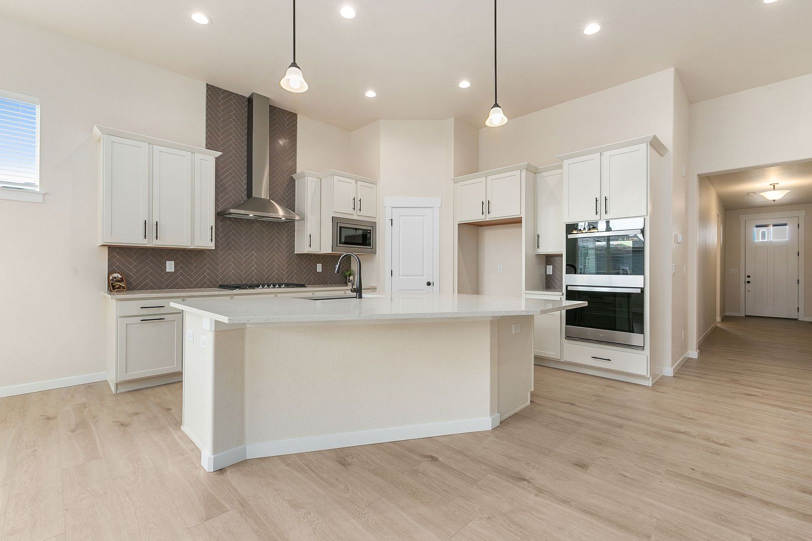 This open-concept layout features a gourmet kitchen, dining nook, and family room, all boasting 11-foot ceilings and a cozy corner gas fireplace. The gourmet kitchen is equipped with stainless steel double ovens, a gas cooktop with a designer hood, a walk-in pantry, and a large quartz island. Enjoy entertaining on the oversized island or in the sunlit dining nook.
