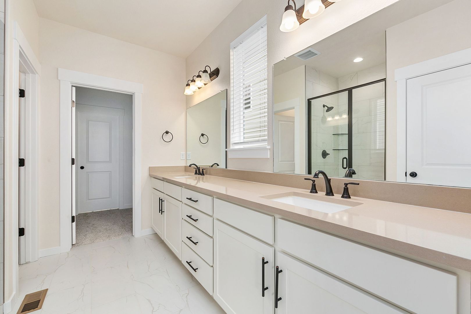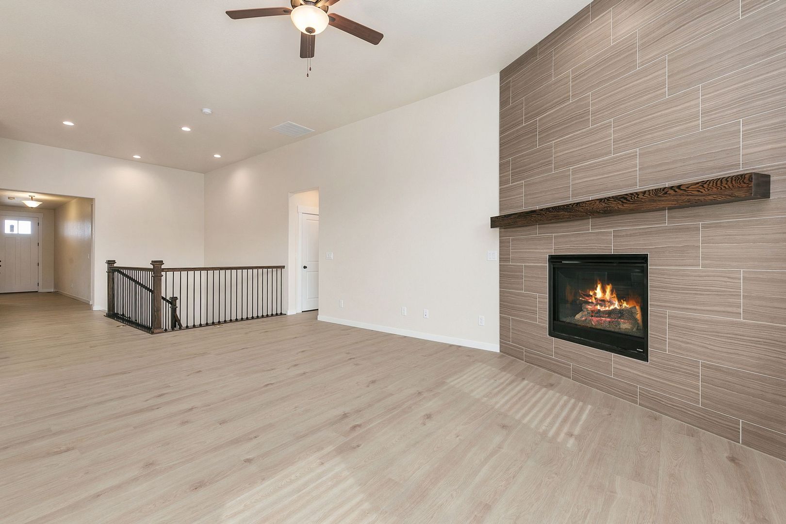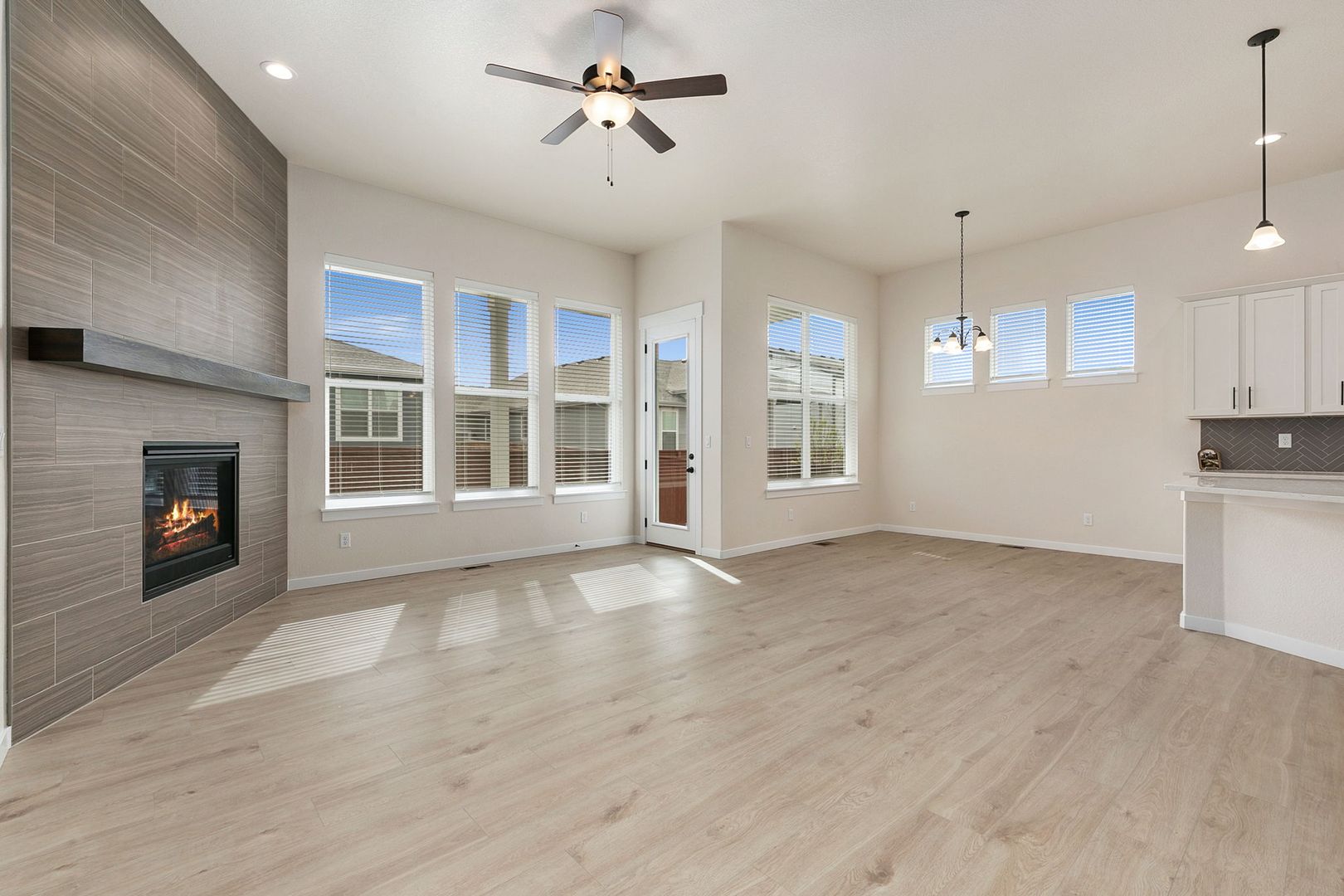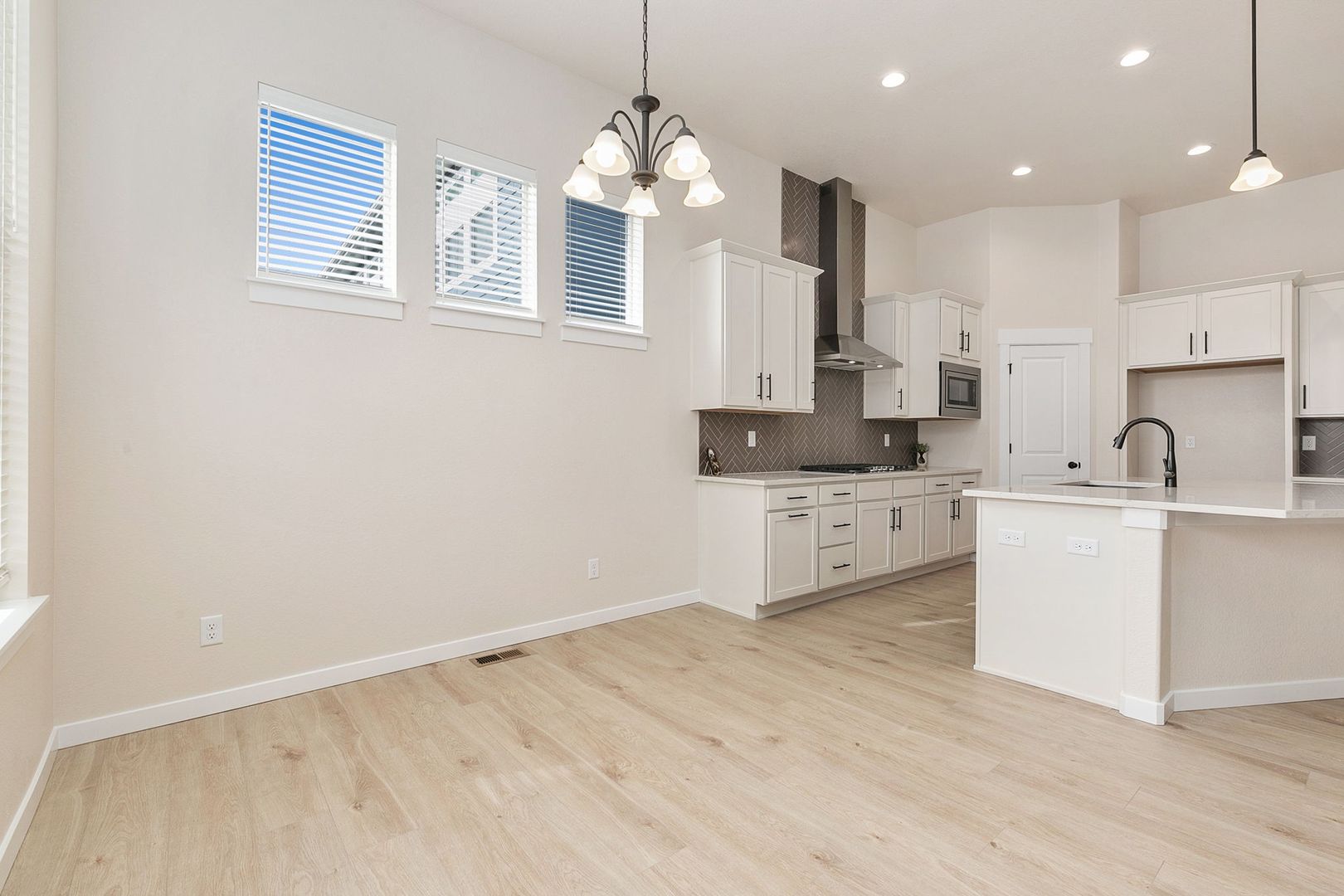 This open-concept layout features a gourmet kitchen, dining nook, and family room, all boasting 11-foot ceilings and a cozy corner gas fireplace. The gourmet kitchen is equipped with stainless steel double ovens, a gas cooktop with a designer hood, a walk-in pantry, and a large quartz island. Enjoy entertaining on the oversized island or in the sunlit dining nook.