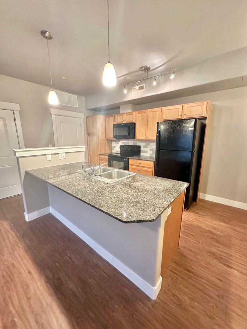 Each condo features a spacious floor plan with wood plank flooring throughout the kitchen and living areas. The kitchen is equipped with a granite slab countertop, tile backsplash, sleek black appliances, and an island that overlooks the living room. The master bedroom includes a generous walk-in closet and a private bathroom.