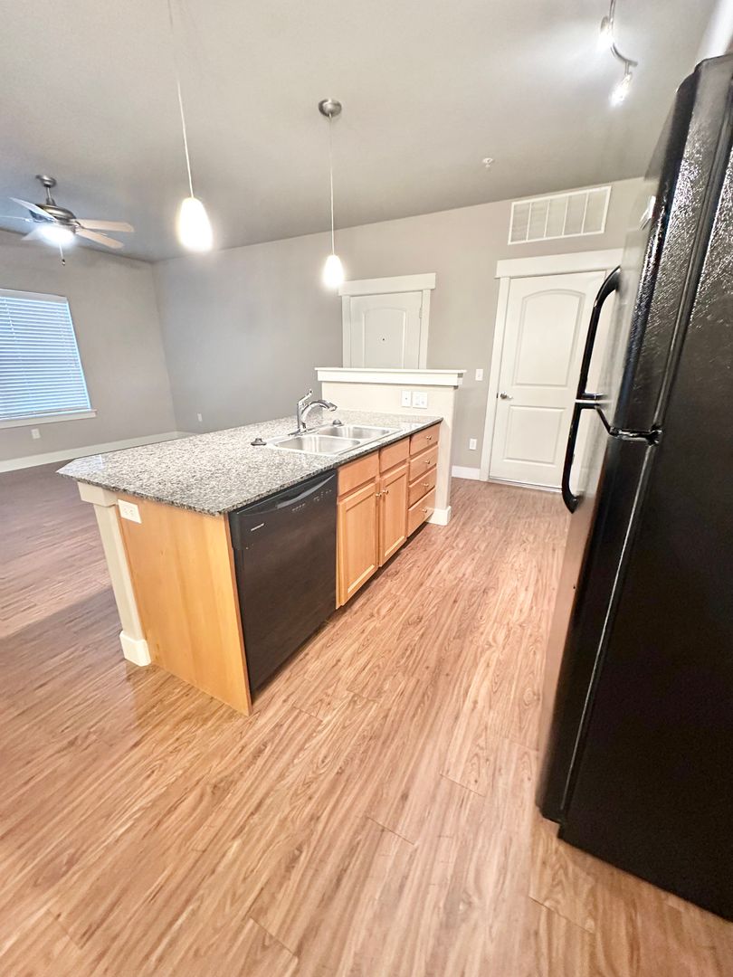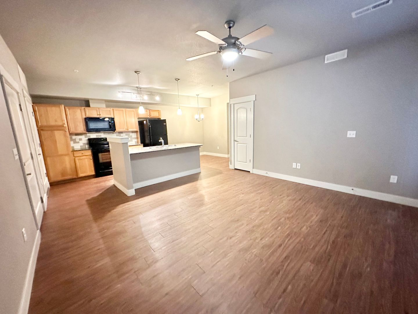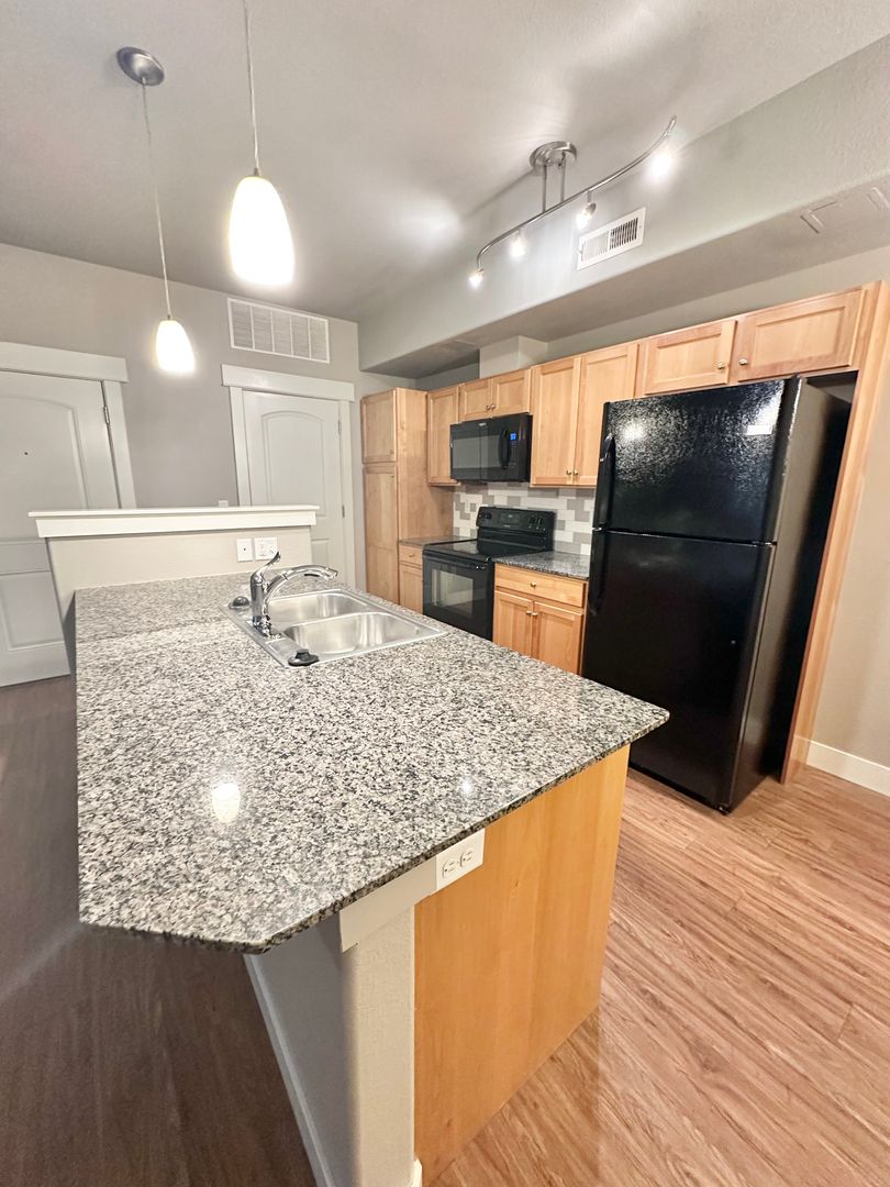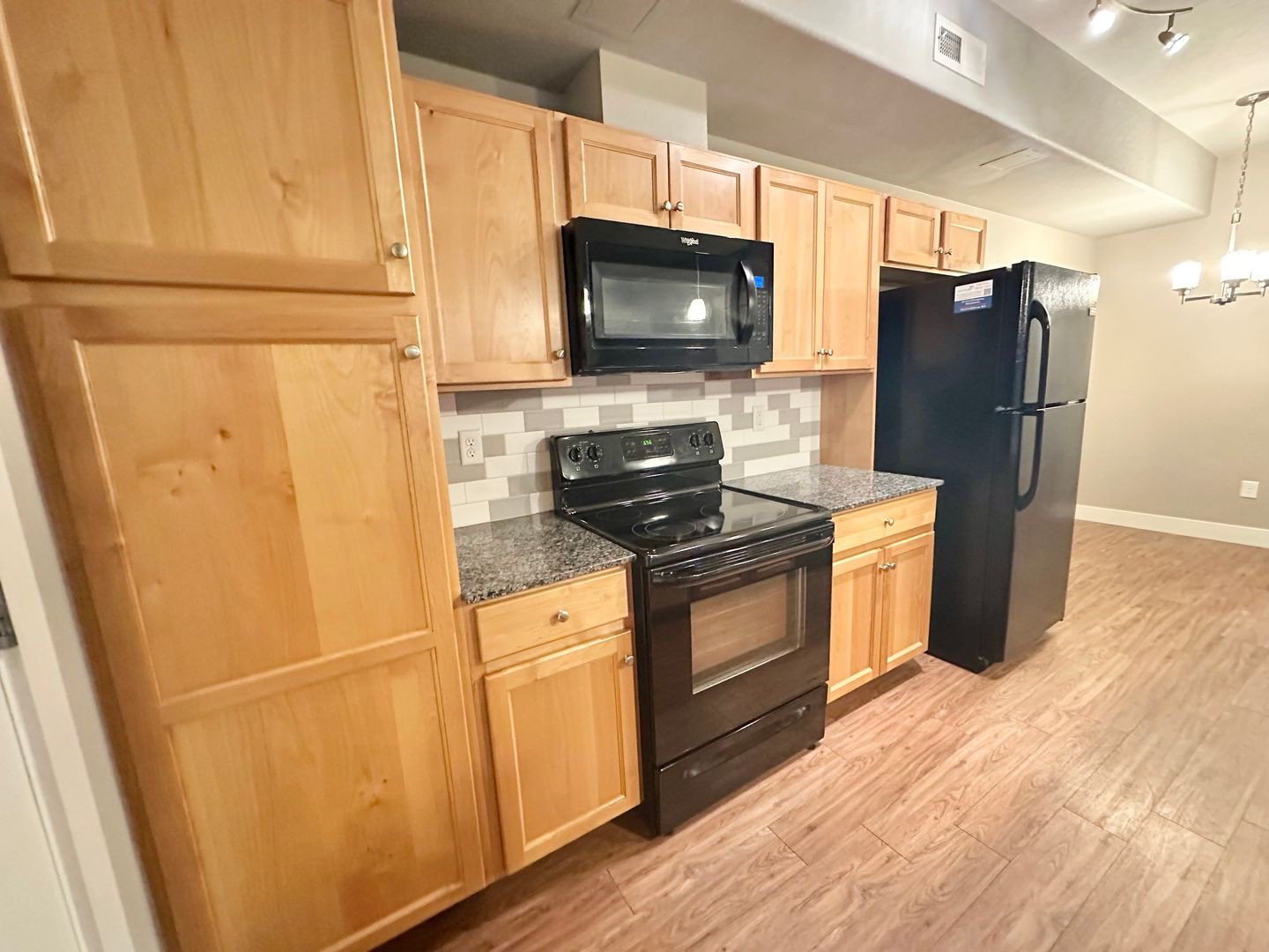 Each condo features a spacious floor plan with wood plank flooring throughout the kitchen and living areas. The kitchen is equipped with a granite slab countertop, tile backsplash, sleek black appliances, and an island that overlooks the living room. The master bedroom includes a generous walk-in closet and a private bathroom.